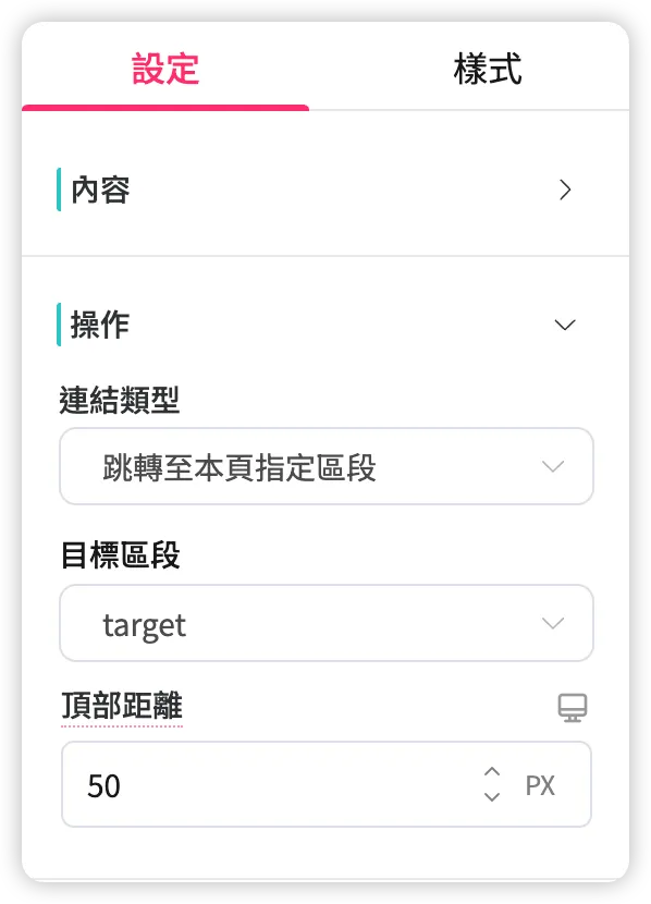 [連結類型] 設為「跳轉至本頁指定區段」