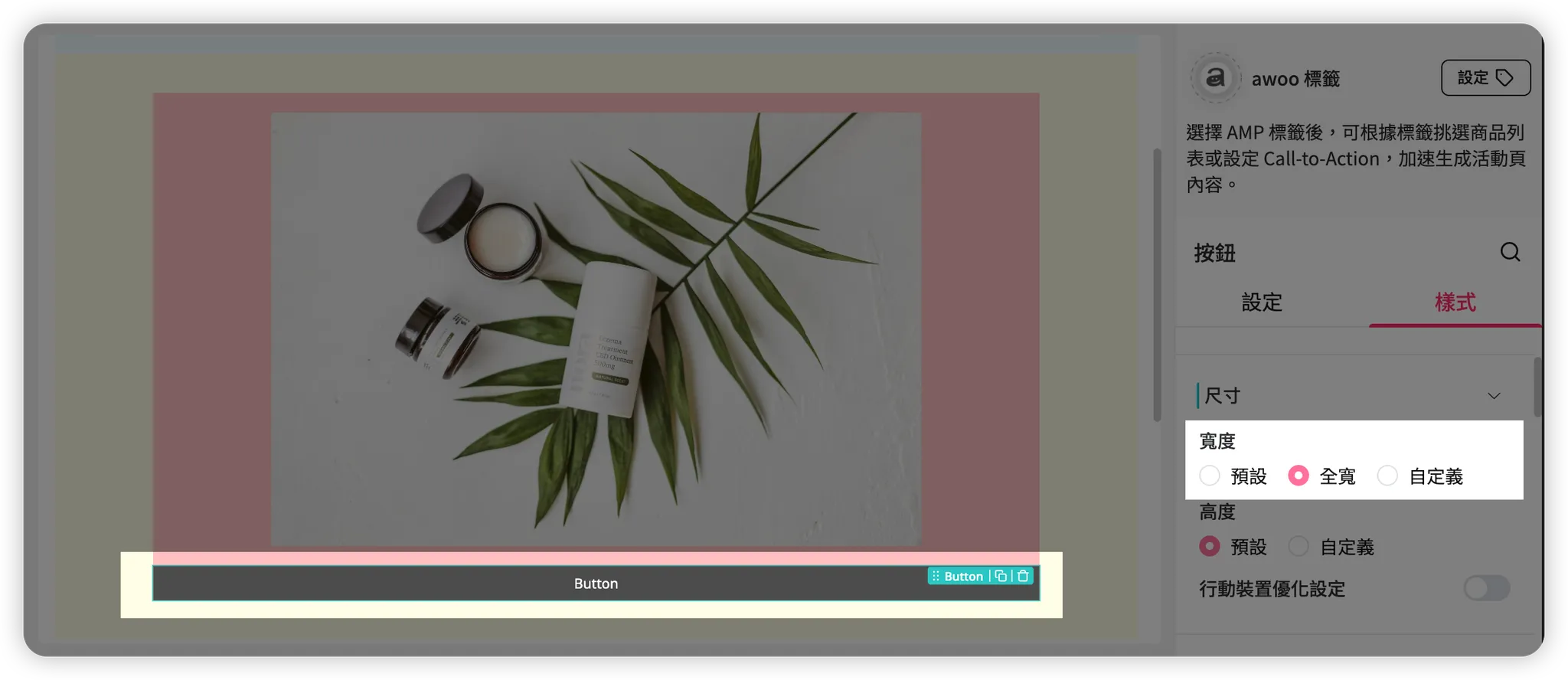 按鈕的寬度設定單一 Button 元件 入口:右側元件設定面板 > 樣式 tab > 尺寸 預設值:「預設」,此時會以按鈕文案的寬度為準 若改成「全寬」,會以上層母結構 (Column) 的寬度為準 Updated about 2 months ago 頁面、區段、列的最大寬度設定欄的高度設定Table of Contents 單一 Button 元件