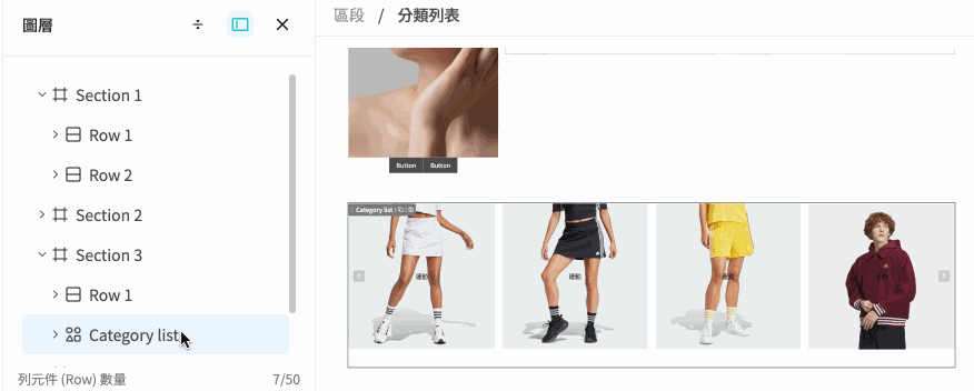 例如:把「Row 3」變成「CTA 橫幅」、把「Category list」變成「運動系列分類」。