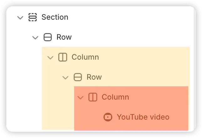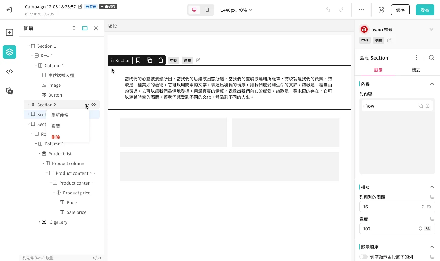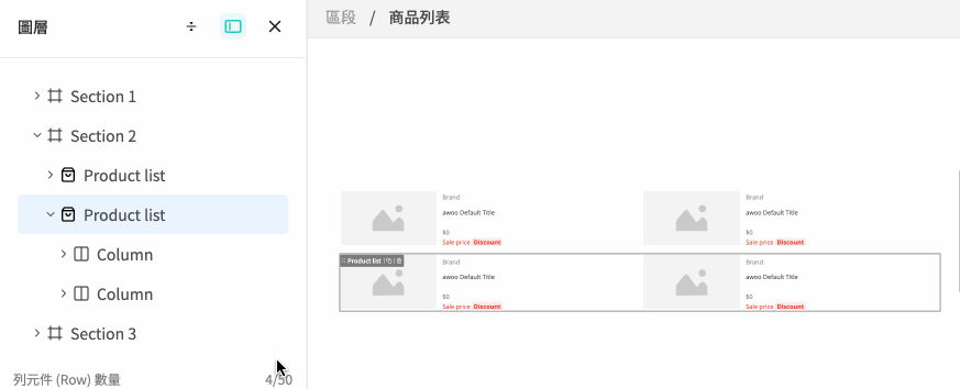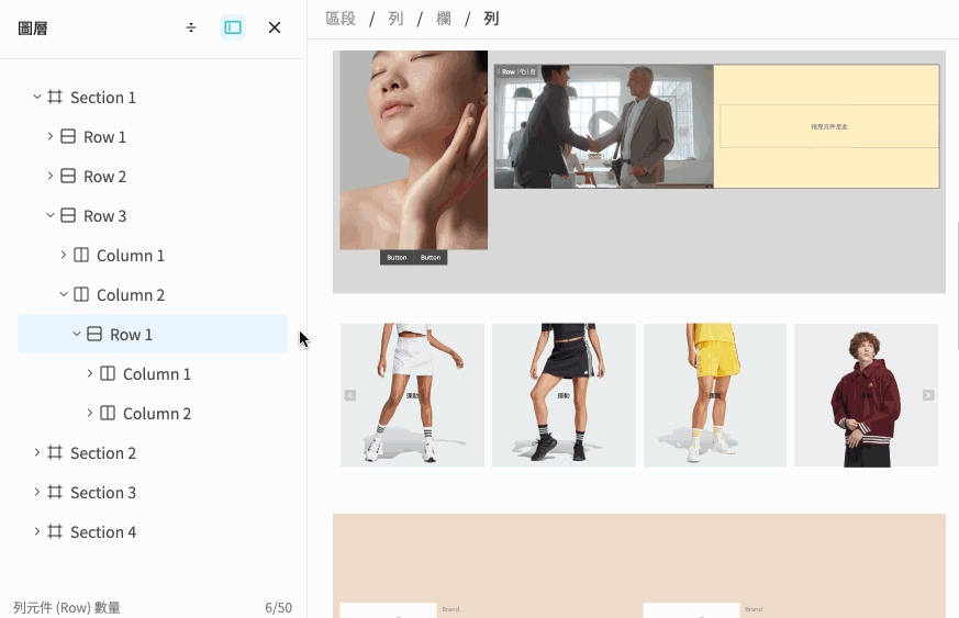 例如:把黃底的巢狀 Row,拖到白底的 Section2 和棕底的 Section3 之間,讓它變成一個全新的 Section。