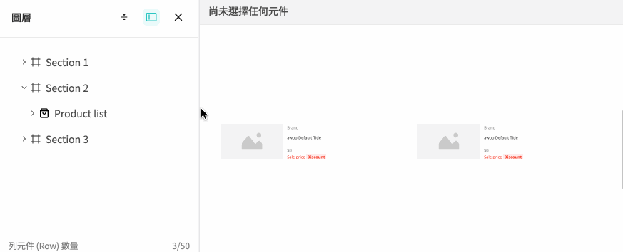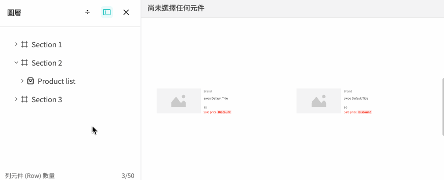 - 針對 Product list、IG gallery 這兩種複合式元件,如果想移除特定某一格的內容,必須到母元件面板 [設定] tab 底下控制列表總格數或塞進格子的內容,不支援從圖層樹個別刪除