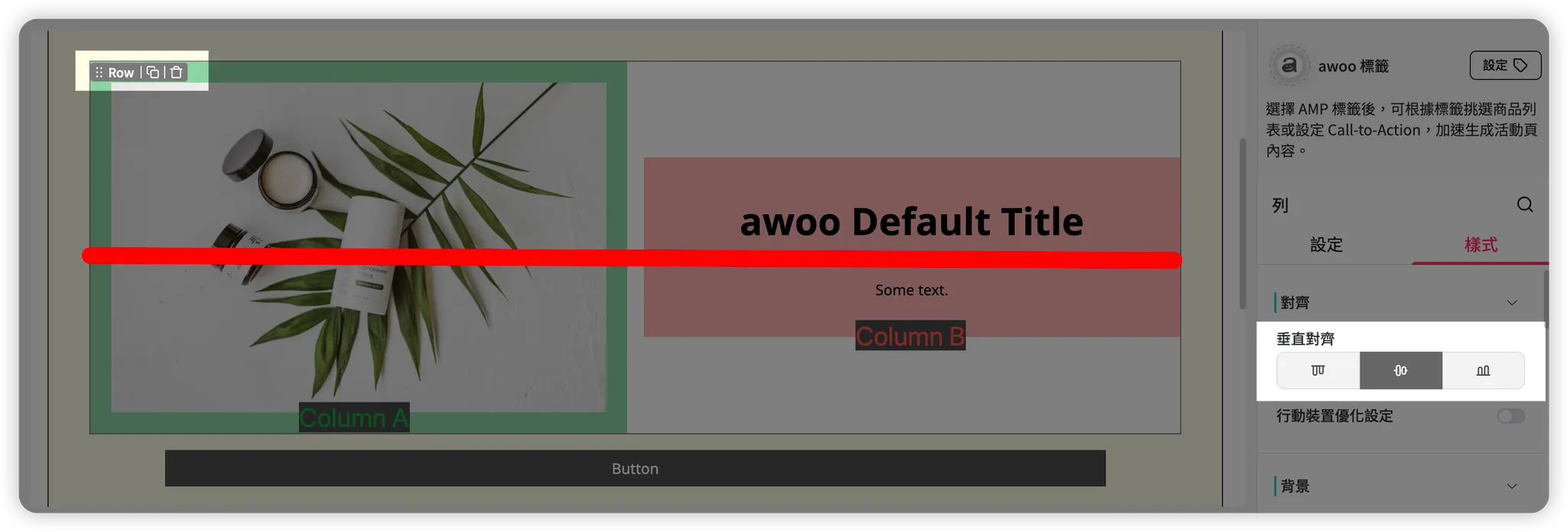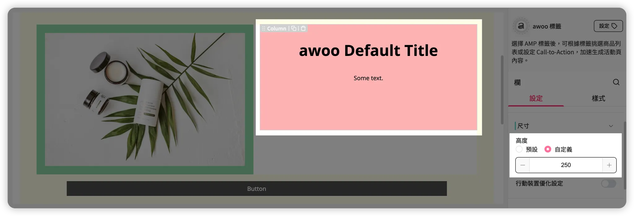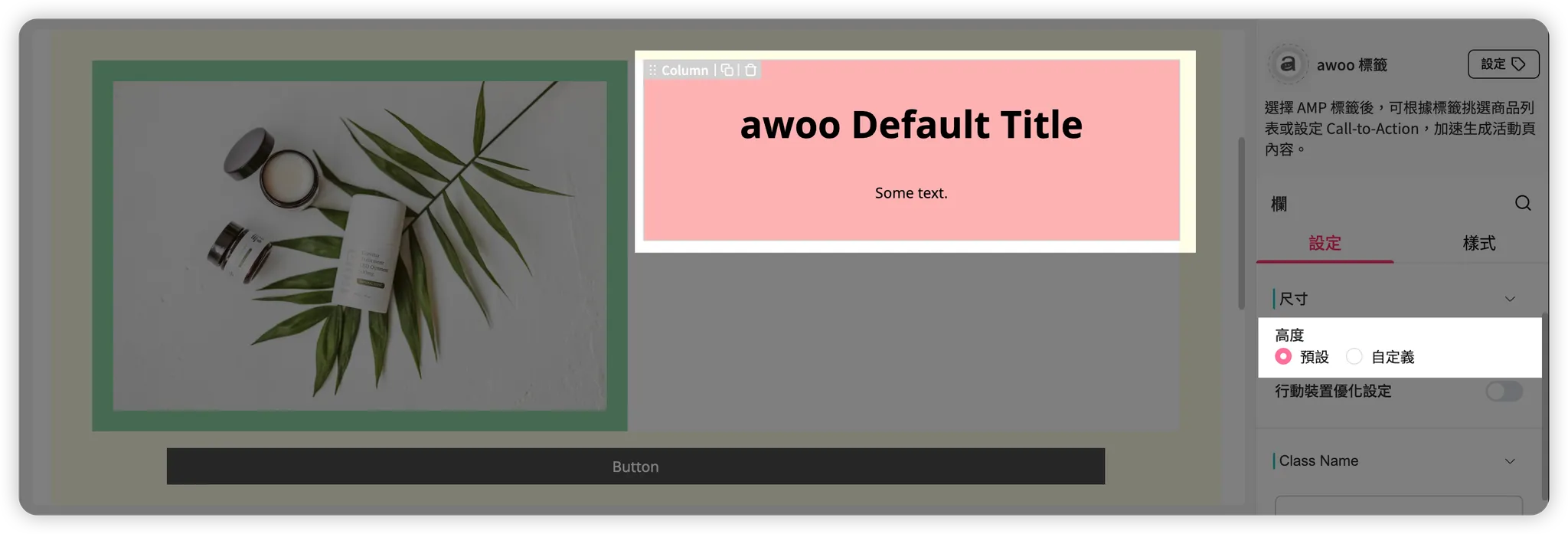 欄的高度設定單一 Column 元件 入口:右側元件設定面板 > 設定 tab > 尺寸 預設值:「自動」,此時會依 Column 內部子元件的高度決定這個 Column 的高度 若改成「自定義」,會以指定的高度為準 💡 其他小技巧 當一個 Row 底下有不同高度的 Column 時,可在 Row 這層設定各 Column 的垂直對齊規則 Updated about 2 months ago 按鈕的寬度設定複製貼上元件樣式的油漆筆Table of Contents 單一 Column 元件 💡 其他小技巧