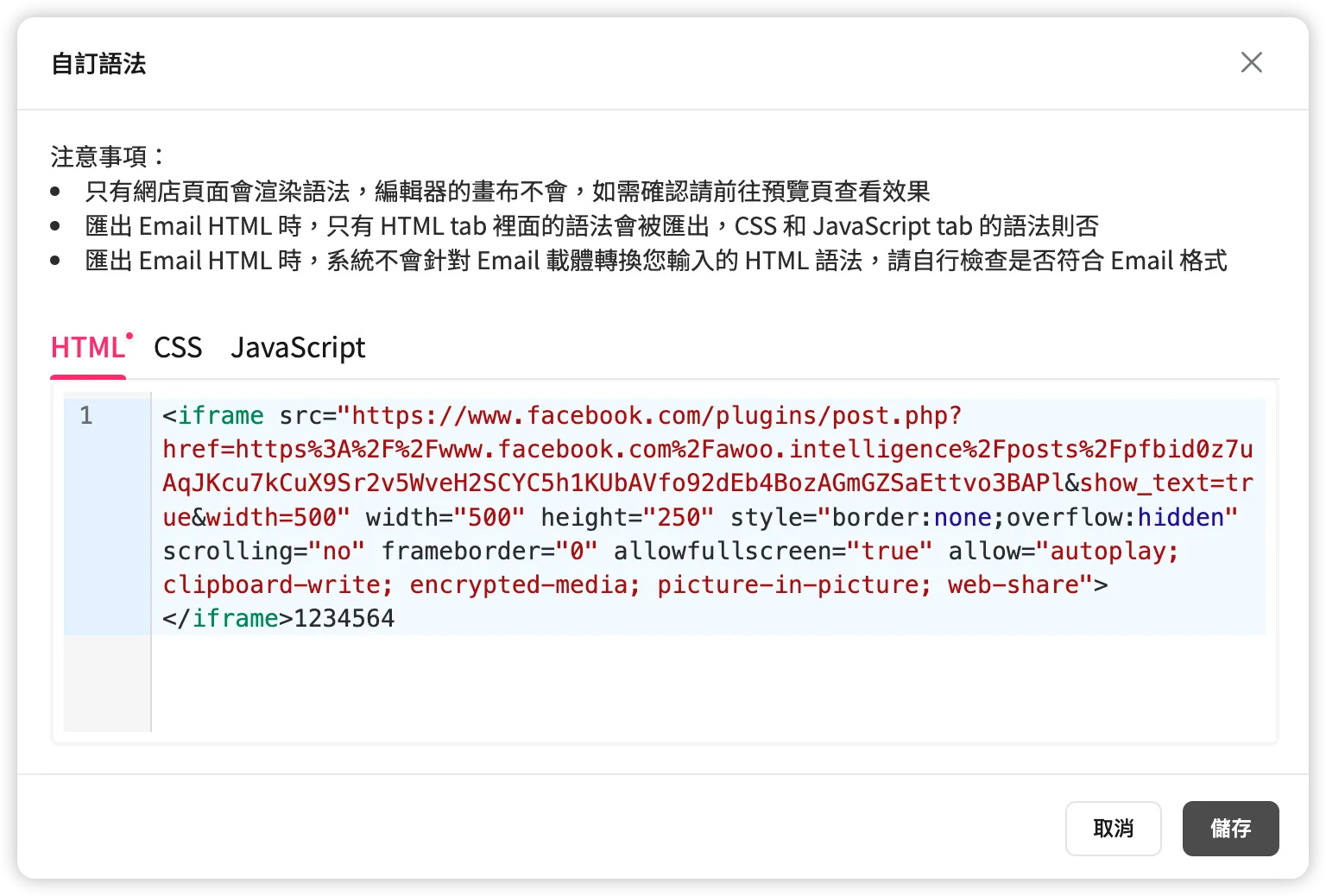 貼上到 Campaign Star 自訂語法元件 code 寫入區的「HTML」tab,按下「儲存」