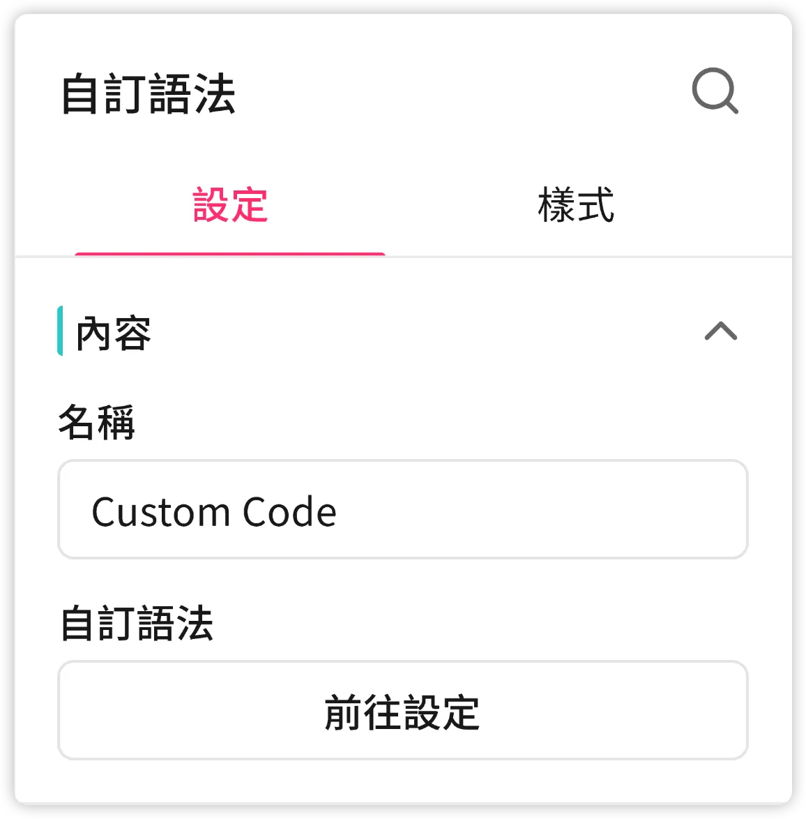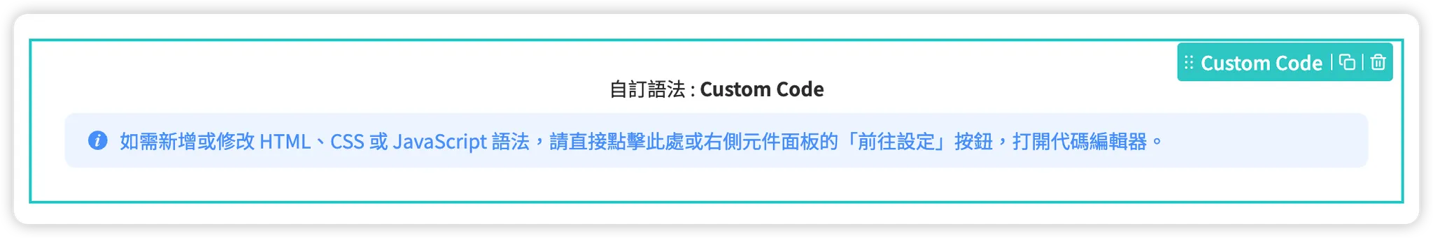 自訂語法:點擊元件面板的「前往設定」按鈕,或直接點擊畫布的提示框後,會叫出寫入 code 的編輯區