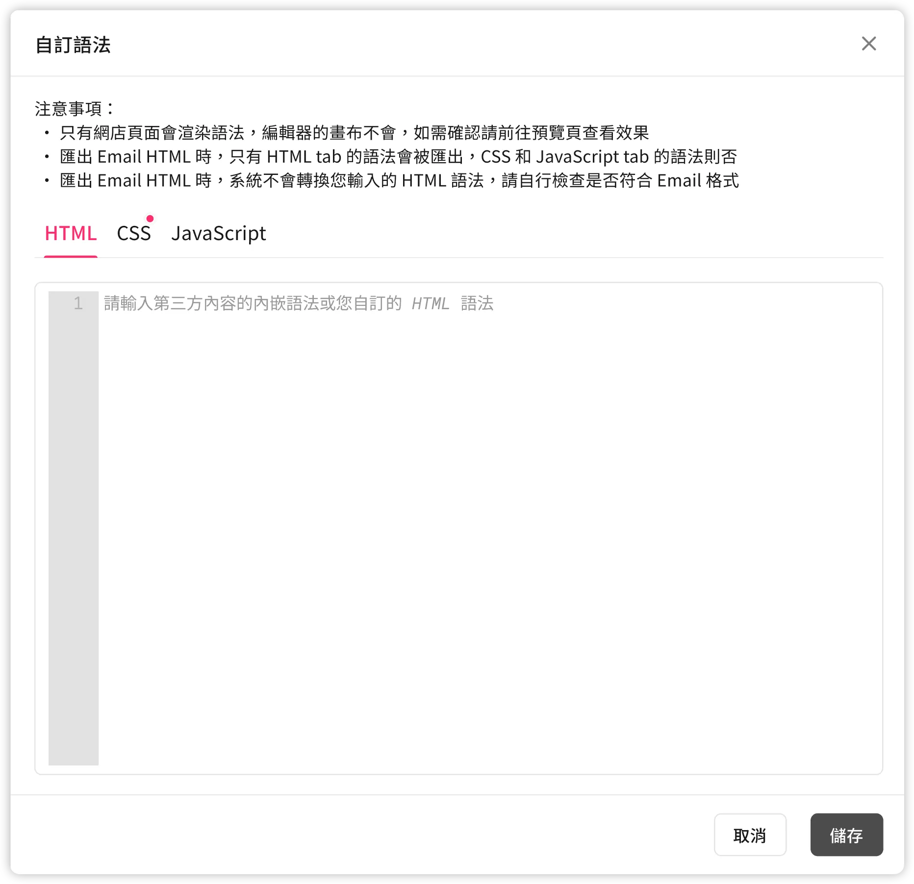 「自訂語法」元件可以讓您在活動頁上的某個區塊,插入 HTML、配合這段 HTML 的 CSS、配合這段 HTML 的 JavaScript 語法,自訂活動頁內容的呈現,或串聯第三方應用服務展示內容。