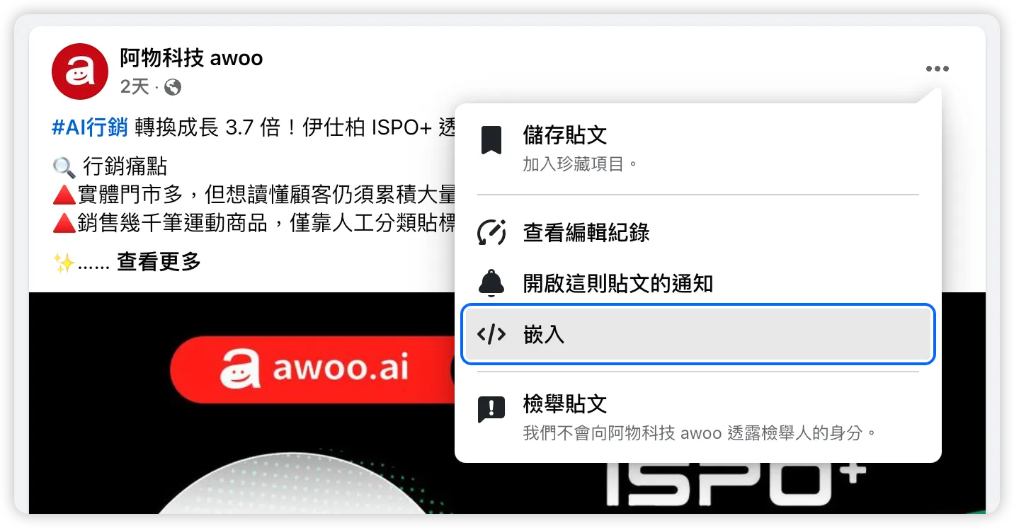 在 Facebook 找到目標貼文,叫出「嵌入」功能