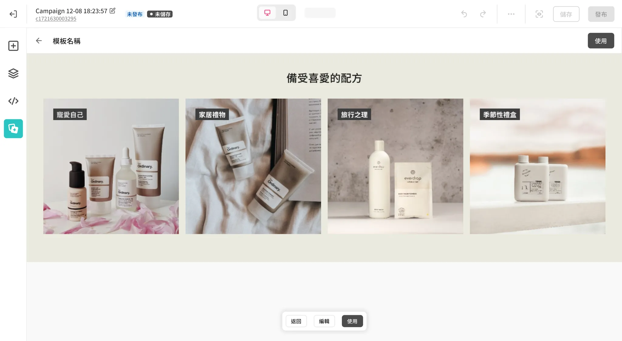 - 此模板編輯器的長相和功能,都非常接近 Campaign Star 的活動頁面編輯器,但畫布有且只有一個 Section,禁止再新增或刪除 Section