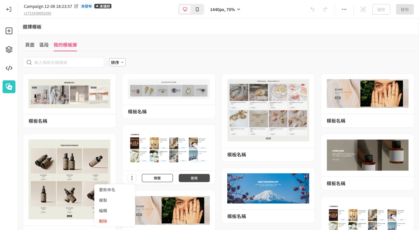 從編輯器左側欄點開完整的模板庫後,進入 [我的模板庫] tab 可查看目前所有的自訂模板