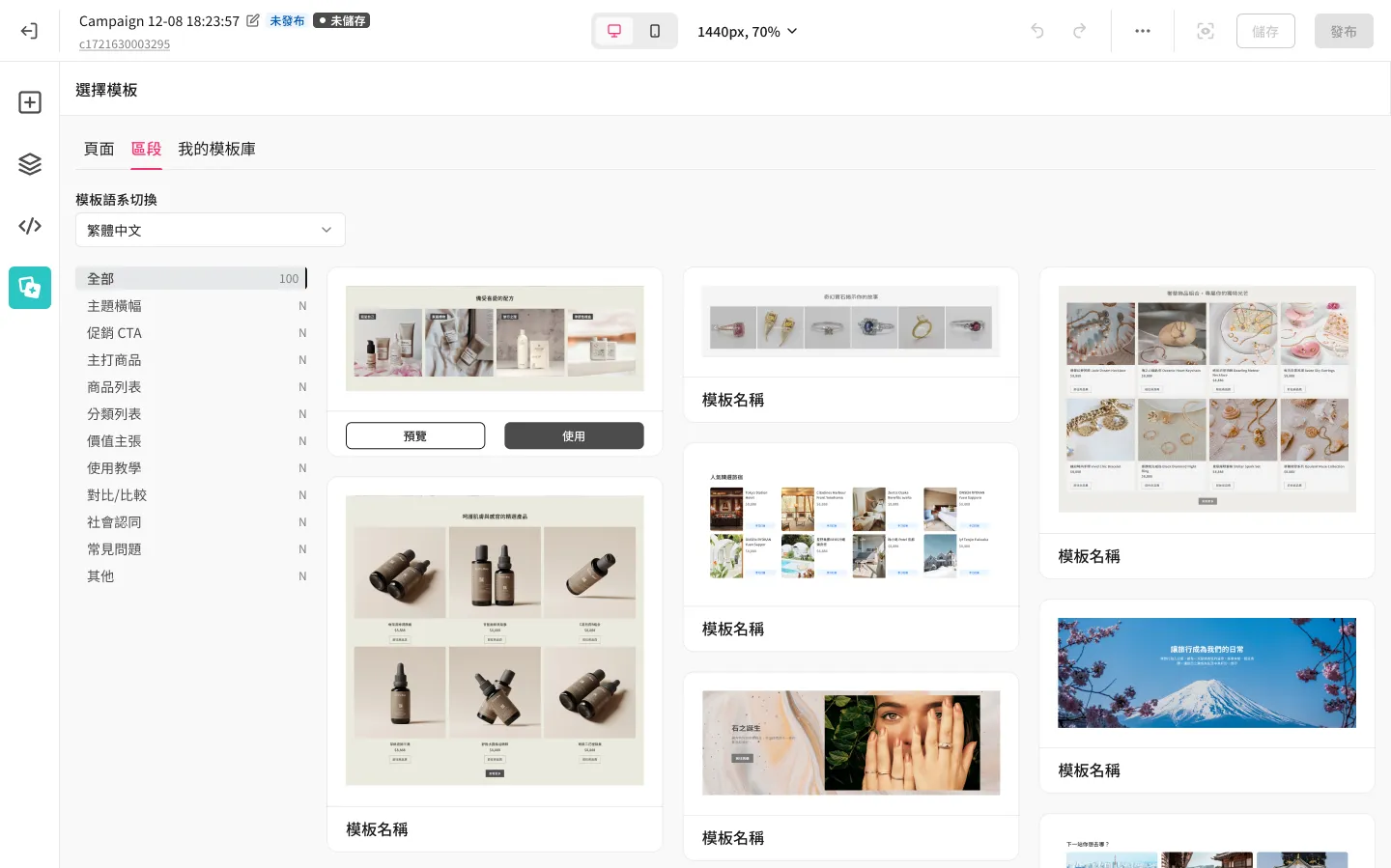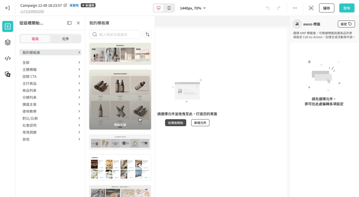 - 也可從畫布左側元件庫面板的 [區段] tab,點按住某個模板,直接拖拉進畫布上想要的位置