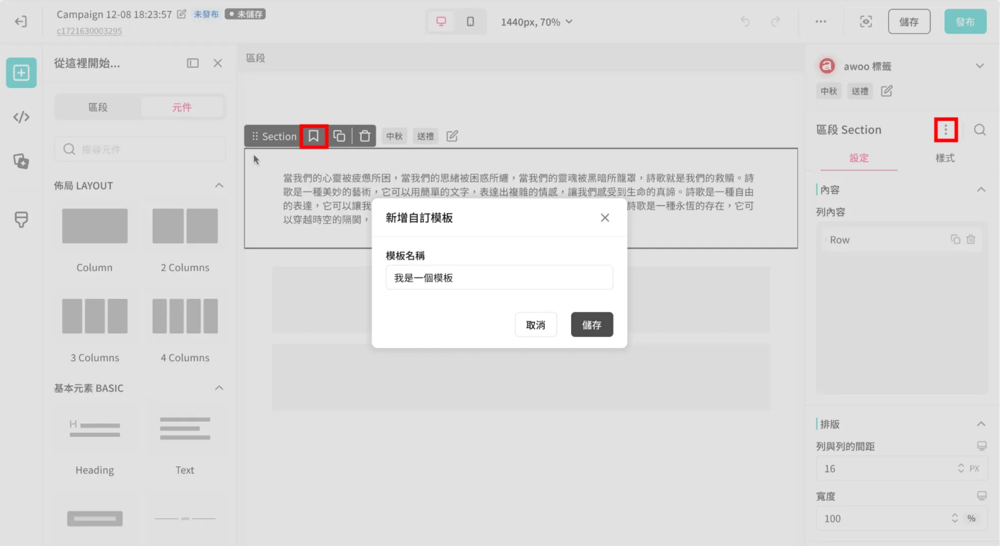 可從 Section 的畫布元件框 或 右側設定面板,選擇「存成區段模板」來新增自訂模板