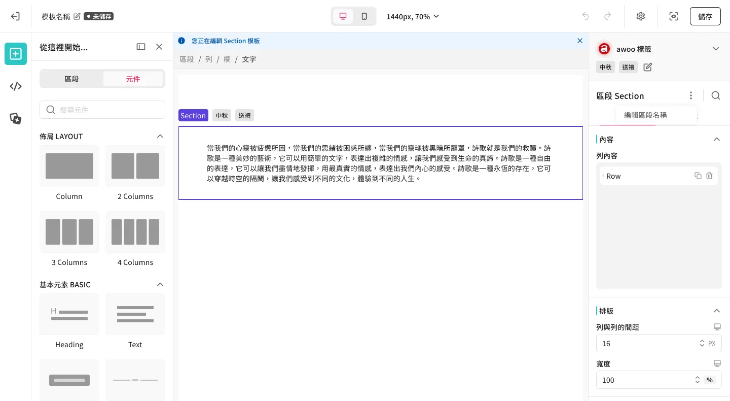 - 為方便區分,畫面上會額外顯示「正在編輯 Section 自訂模板」的提示訊息