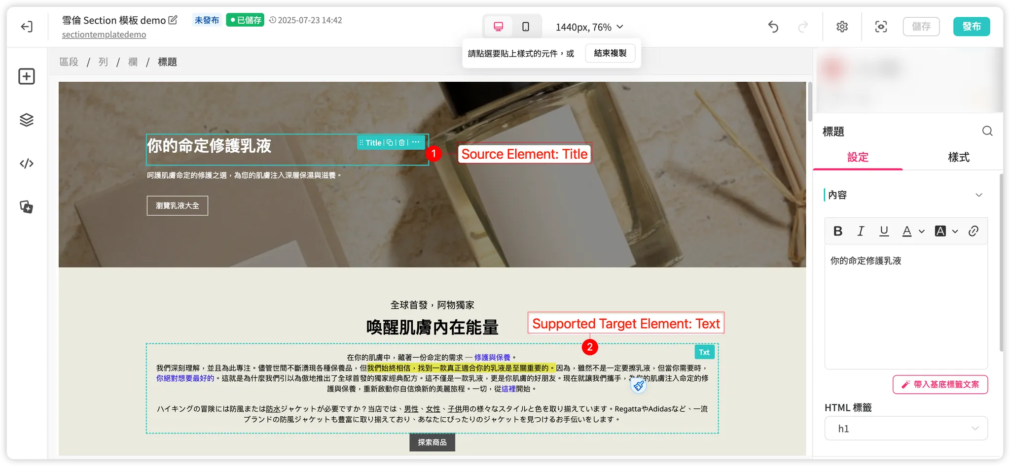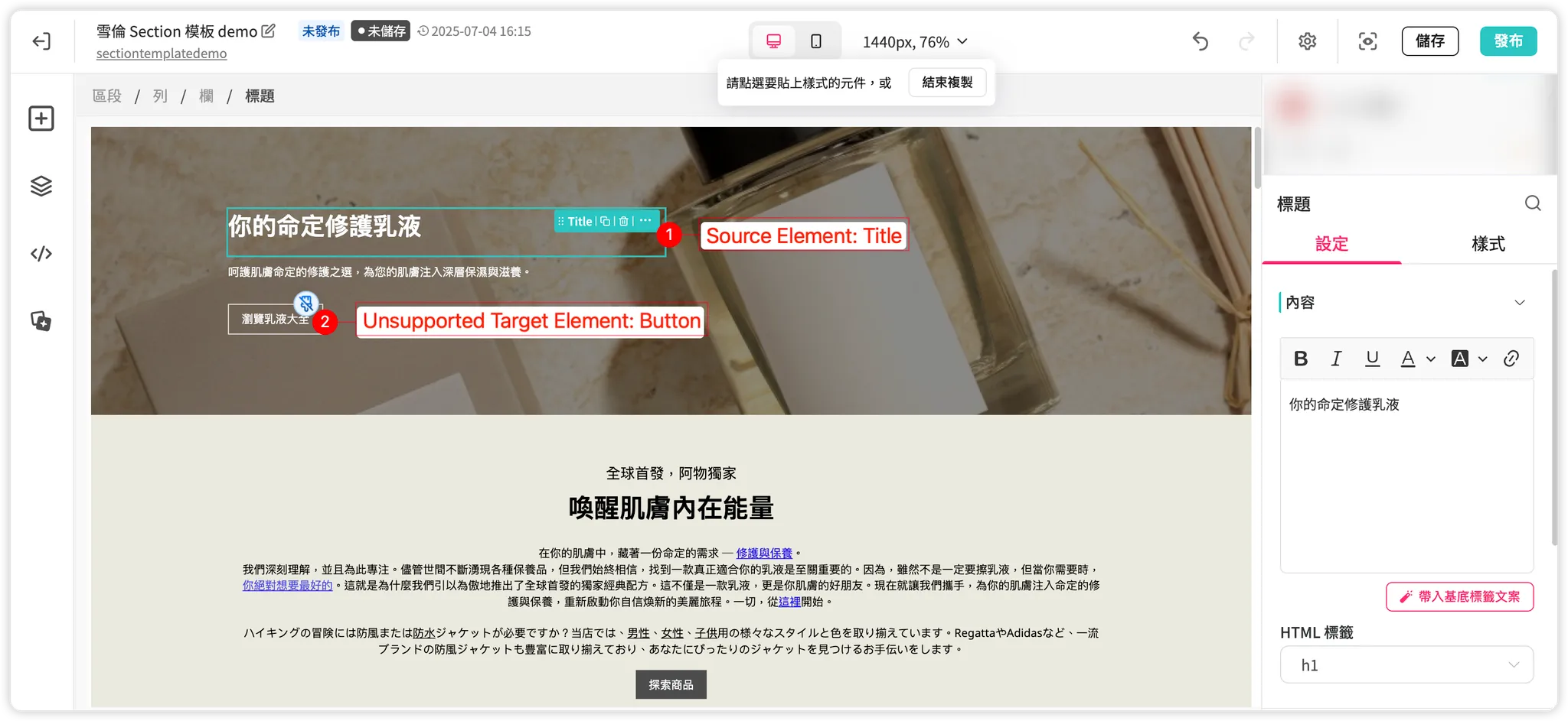 - 此時會以「來源元件」在點擊當下的樣式設定值覆蓋更新「目標元件」的樣式設定值