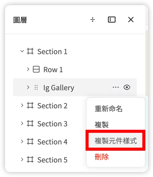 在左側圖層樹,點擊更多操作 menu 裡的「複製元件樣式」