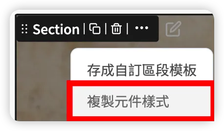 在畫布元件框的操作 label,點擊更多操作 menu 裡的「複製元件樣式」