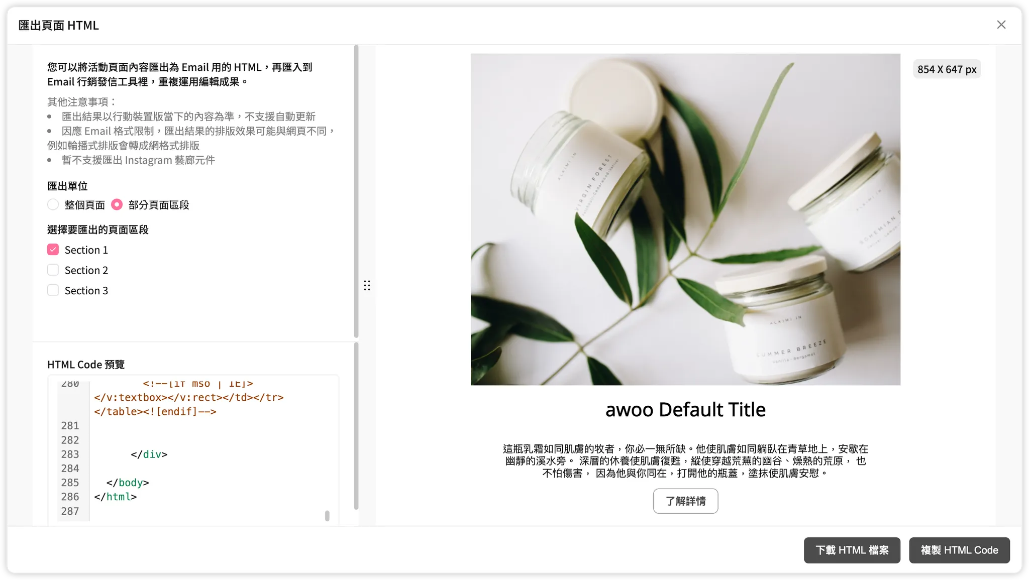 匯出頁面為 Email HTML