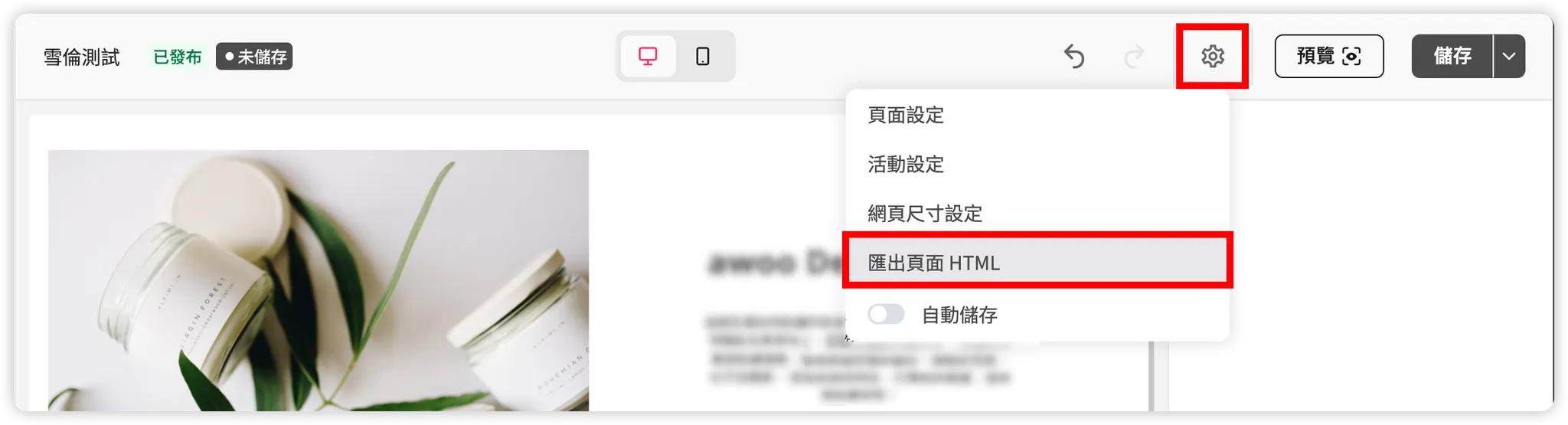 進入頁面編輯器後,點開頂部導覽列的設定齒輪,找到「匯出頁面 HTML」選項