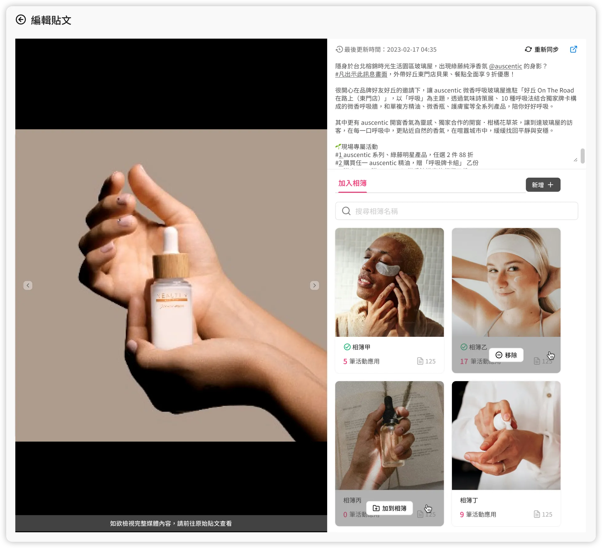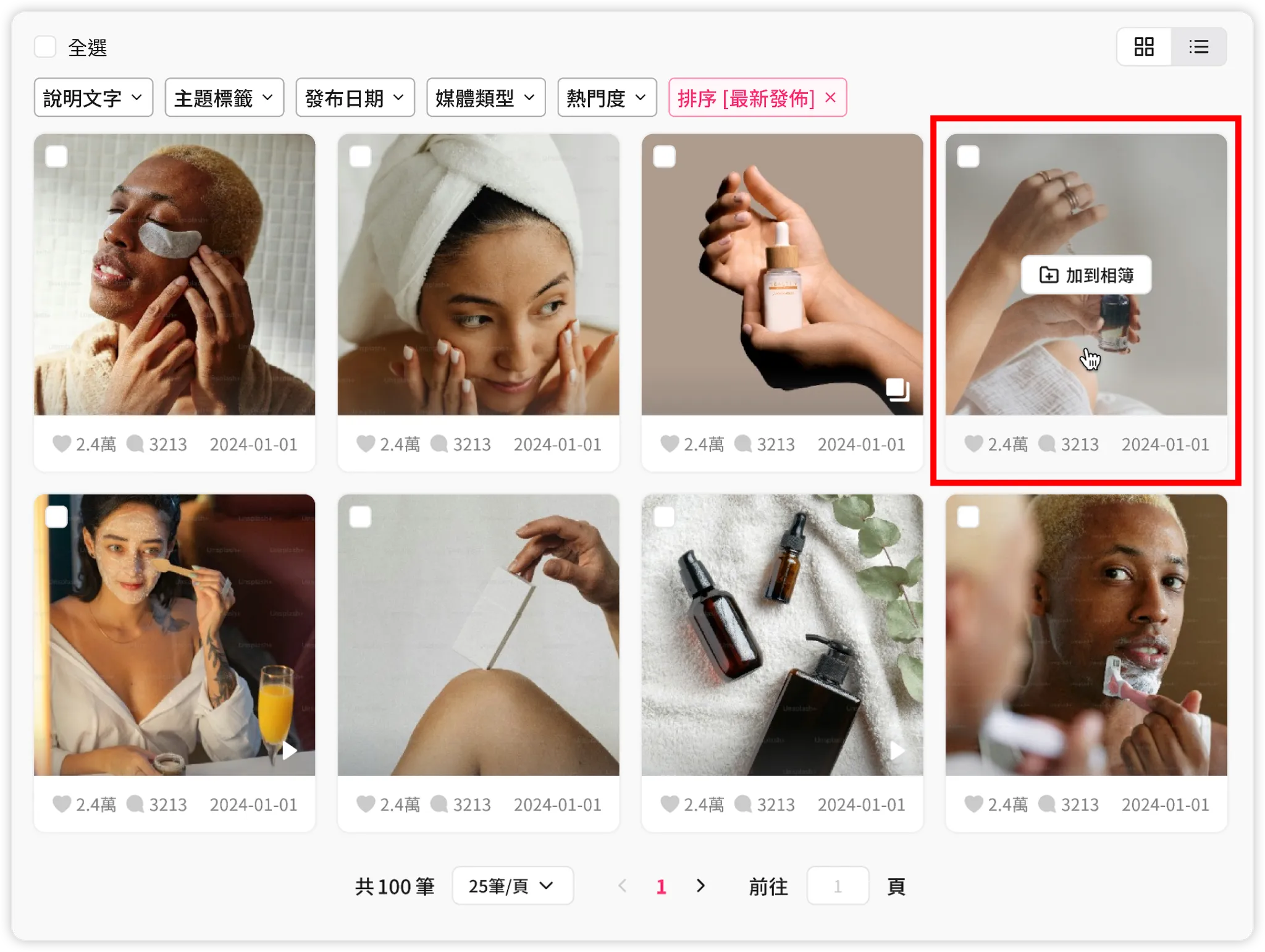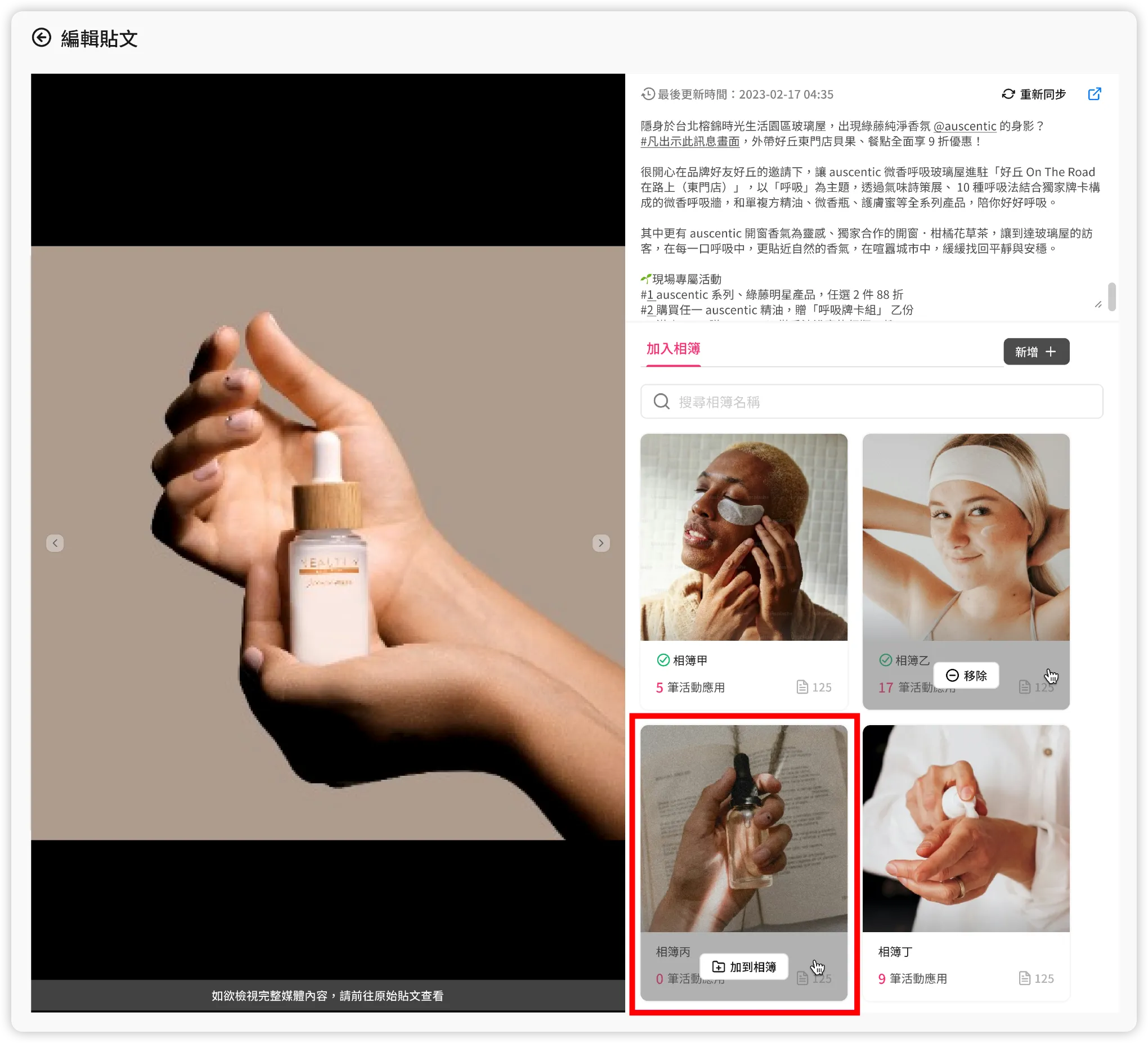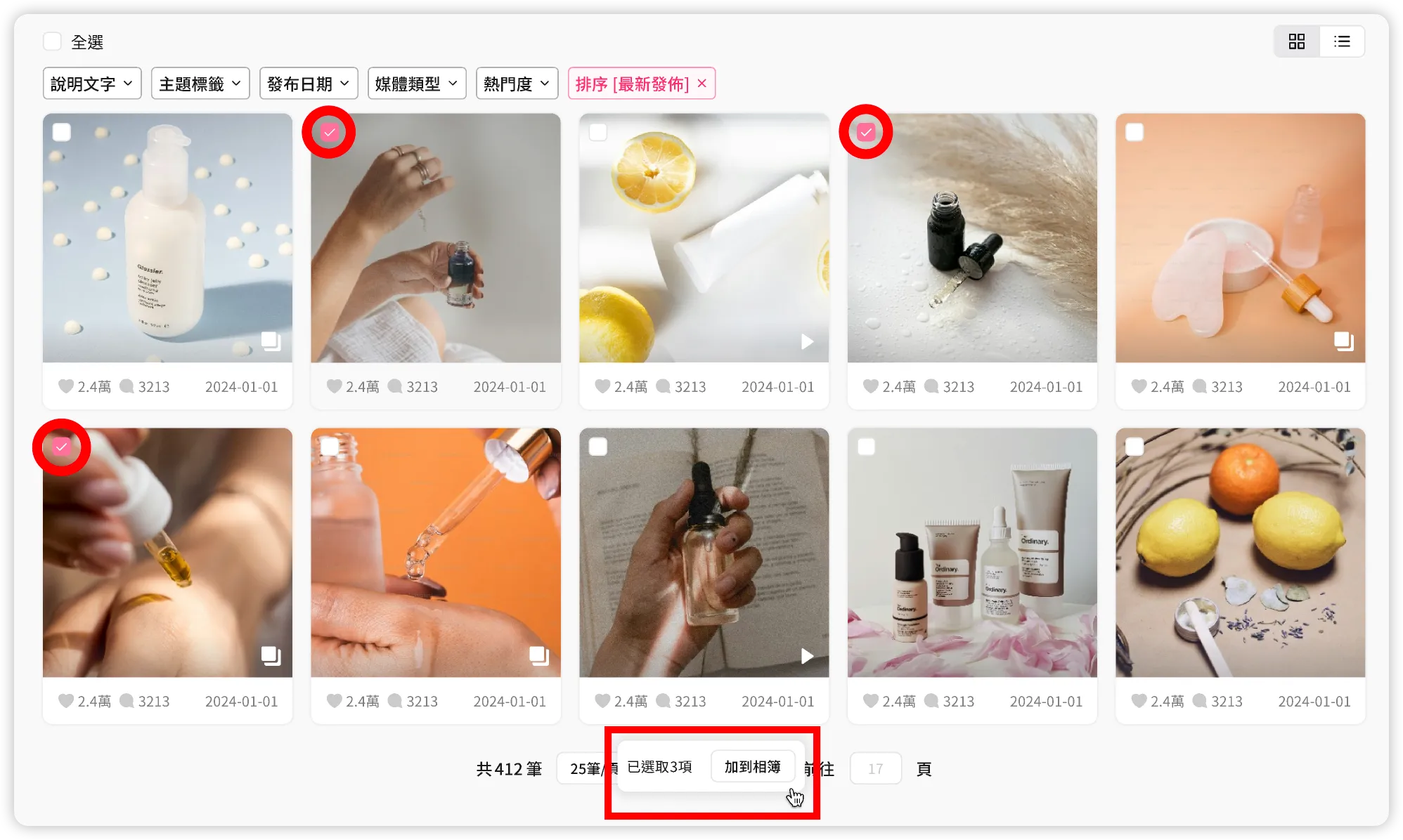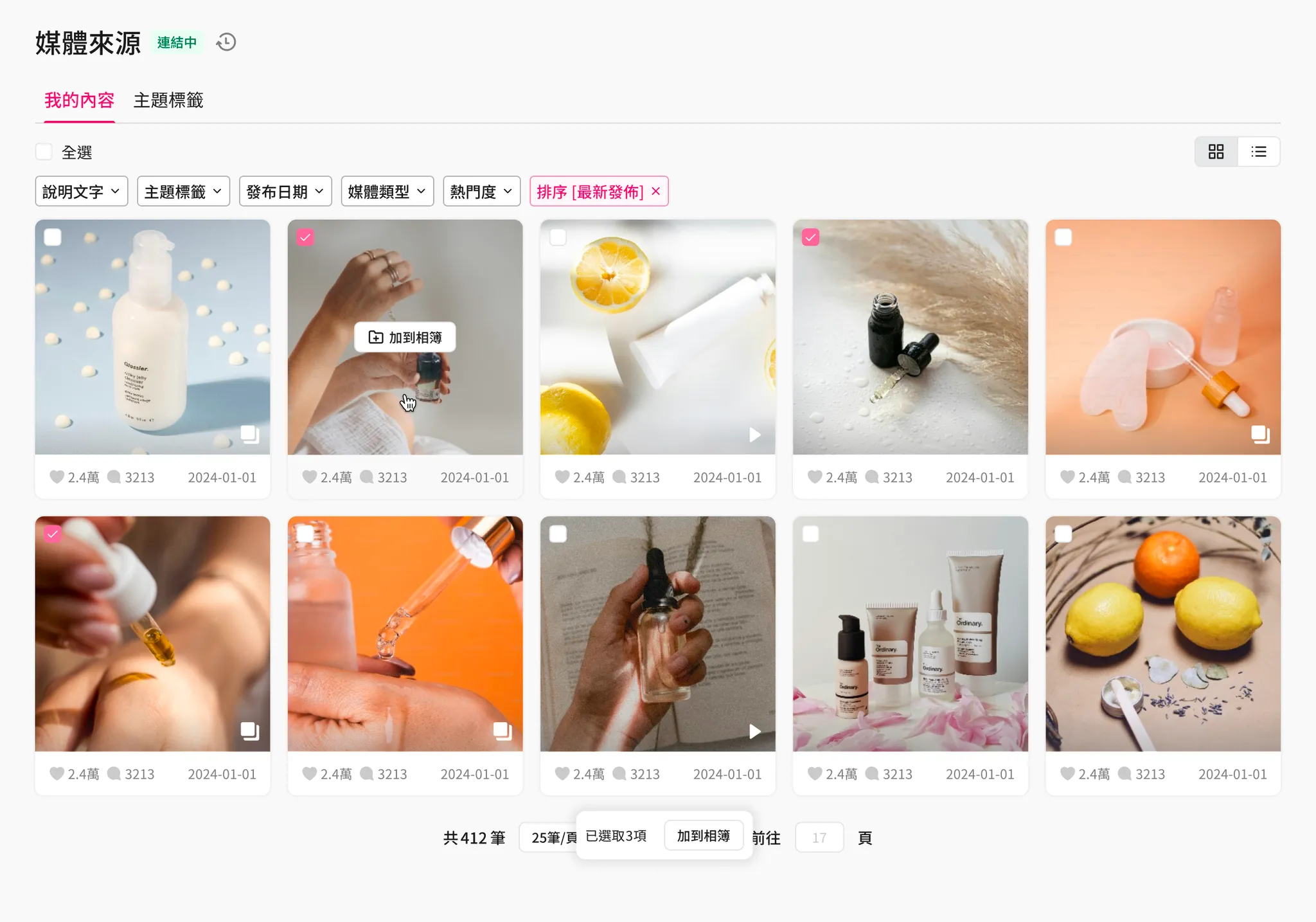 在媒體來源池看到滿意的貼文之後,您需要先把這些貼文加進相簿資料夾,才能進行後續應用和管理。