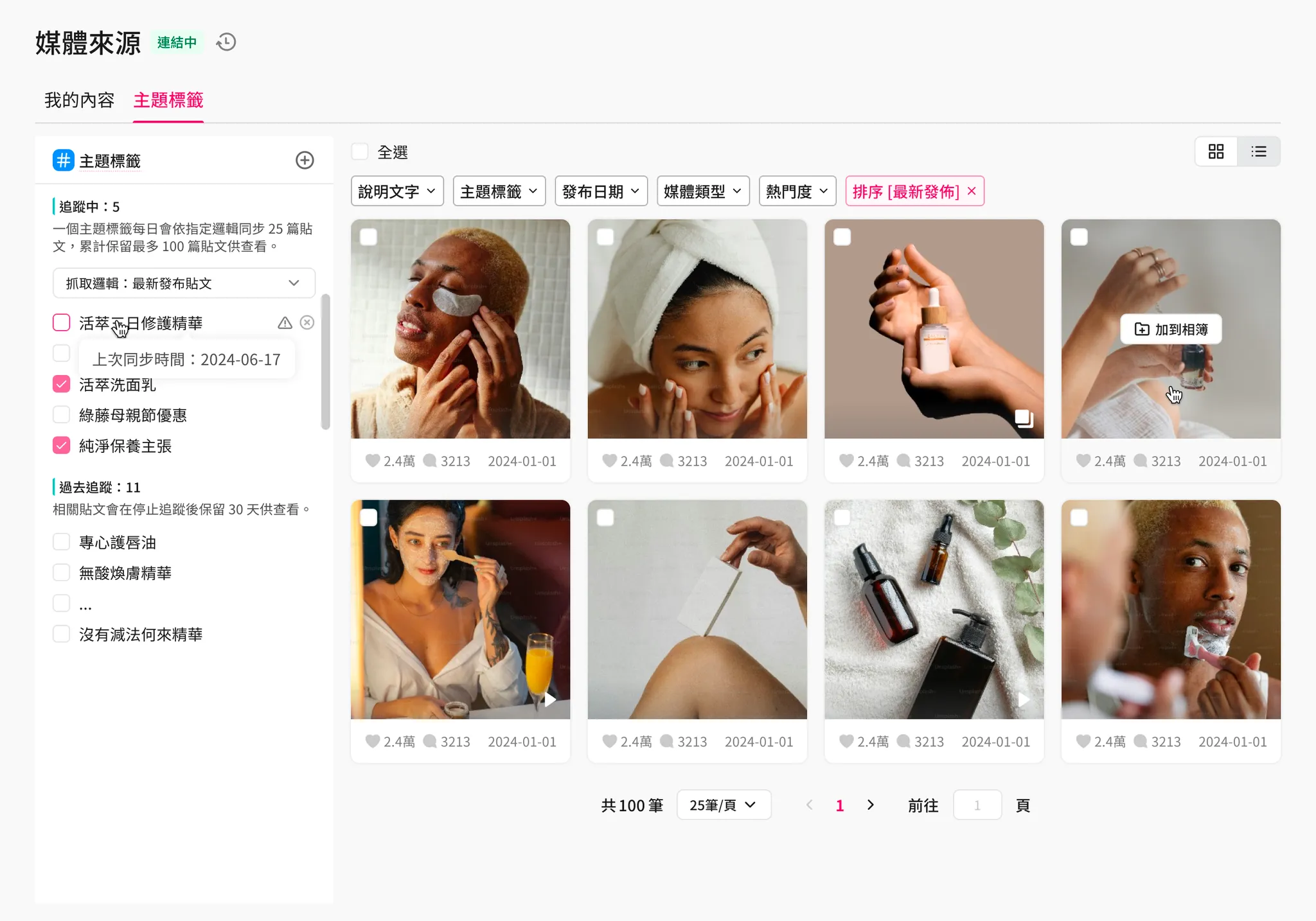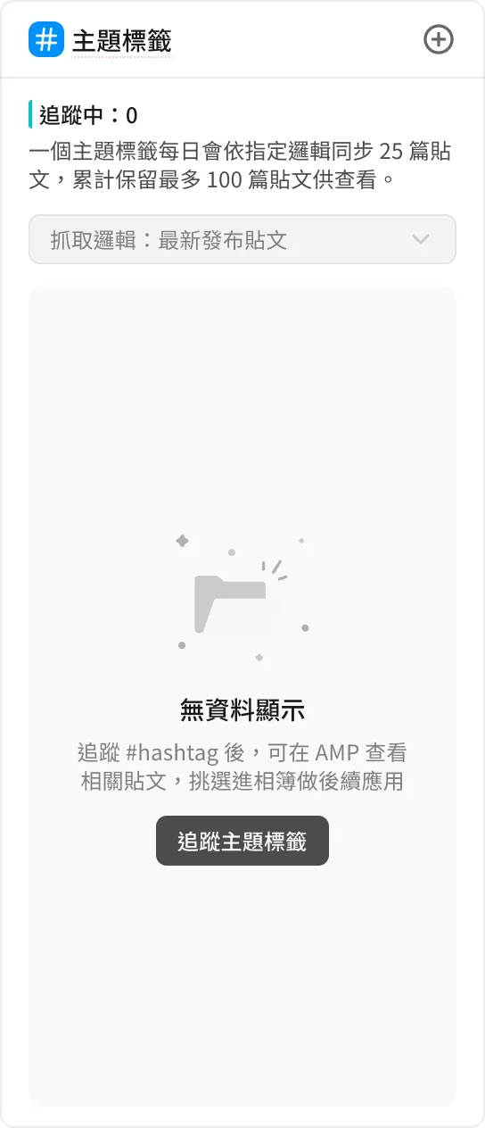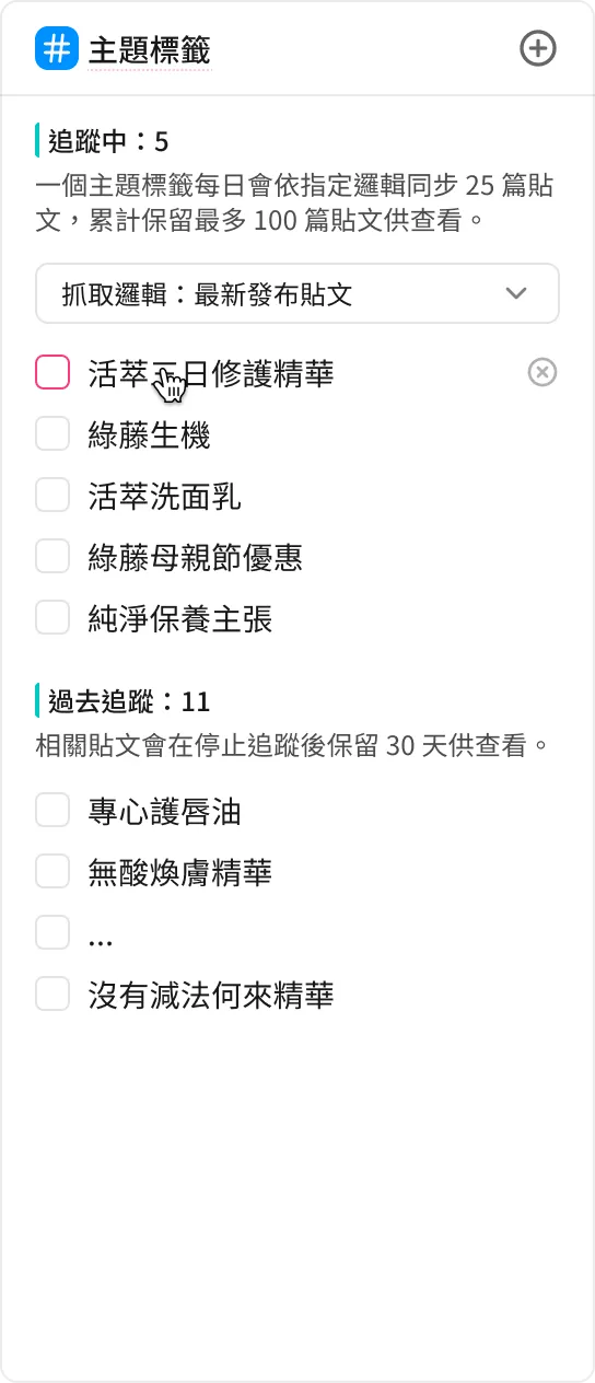- 媒體來源 > 主題標籤 tab 左側的主題標籤追蹤列表:勾選數量不限,會篩出身上有標記任一已勾選的主題標籤的貼文(聯集取 or)