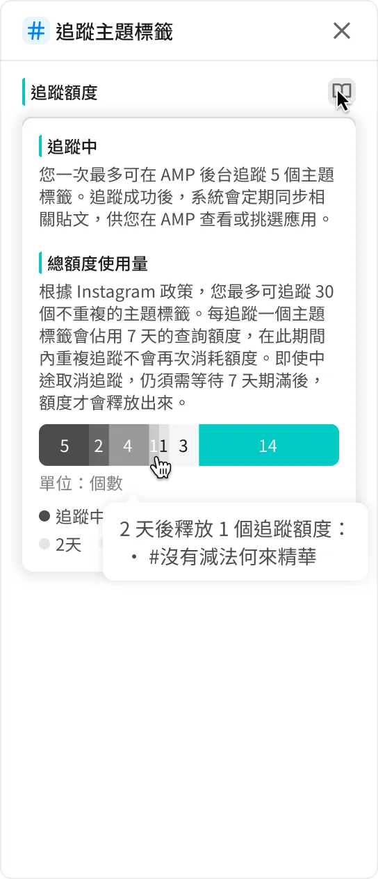 除了 AMP 後台有追蹤額度限制,其實 Instagram 官方也有限制一個 Instagram 帳號只能查詢 30 個不重複的主題標籤,且每一個主題標籤會佔用掉自首次查詢日起七天的查詢額度。一旦用光了這個查詢額度,即使您在 AMP 後台追蹤中的主題標籤數量不滿 5 個,也無法追蹤新的主題標籤。