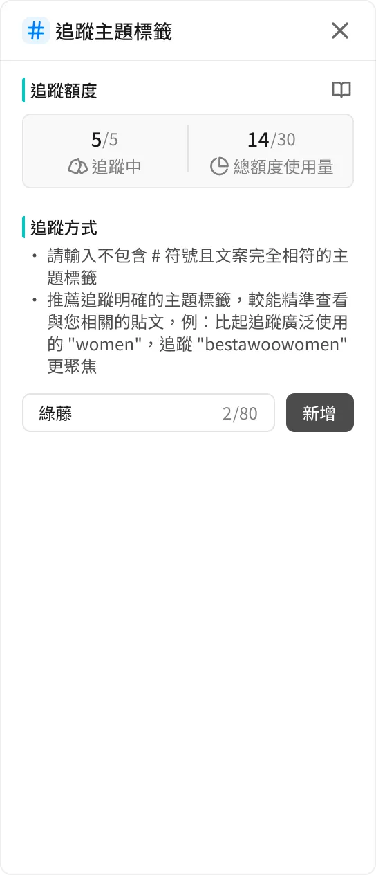 - 為避免出現大量不相干的貼文內容,佔掉每日 25 筆新貼文的同步額度,建議您**追蹤與品牌內容強相關的主題標籤。**例如: