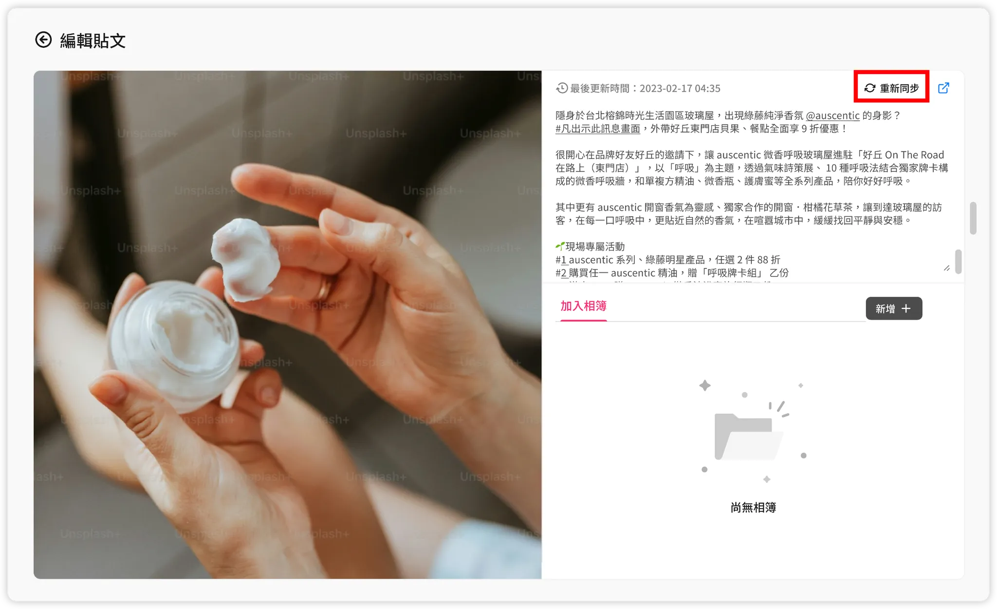 但針對這個「已連結的 Instagram 帳號」自行發布的貼文,您可透過單一貼文檢視畫面的「重新同步」功能,手動更新貼文內容。