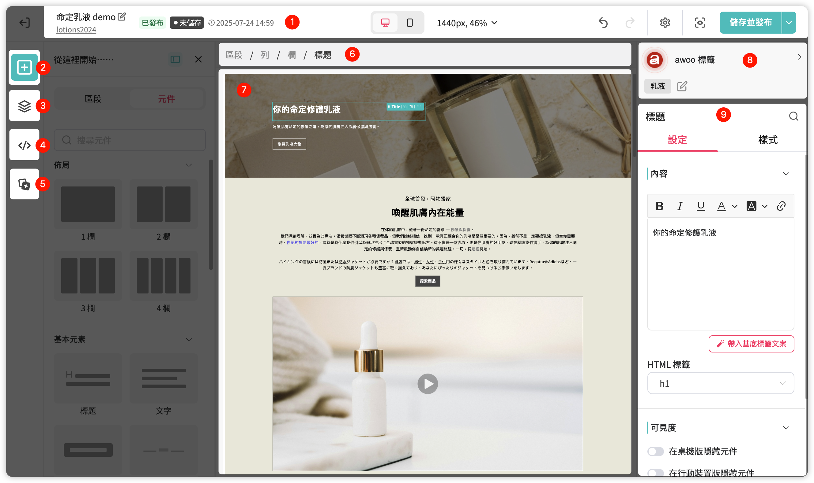 ⓻ 畫布 | 編輯頁面內容的主要操作區塊;在畫布點選切換不同元件,右側元件設定面板會跟著改變 |
