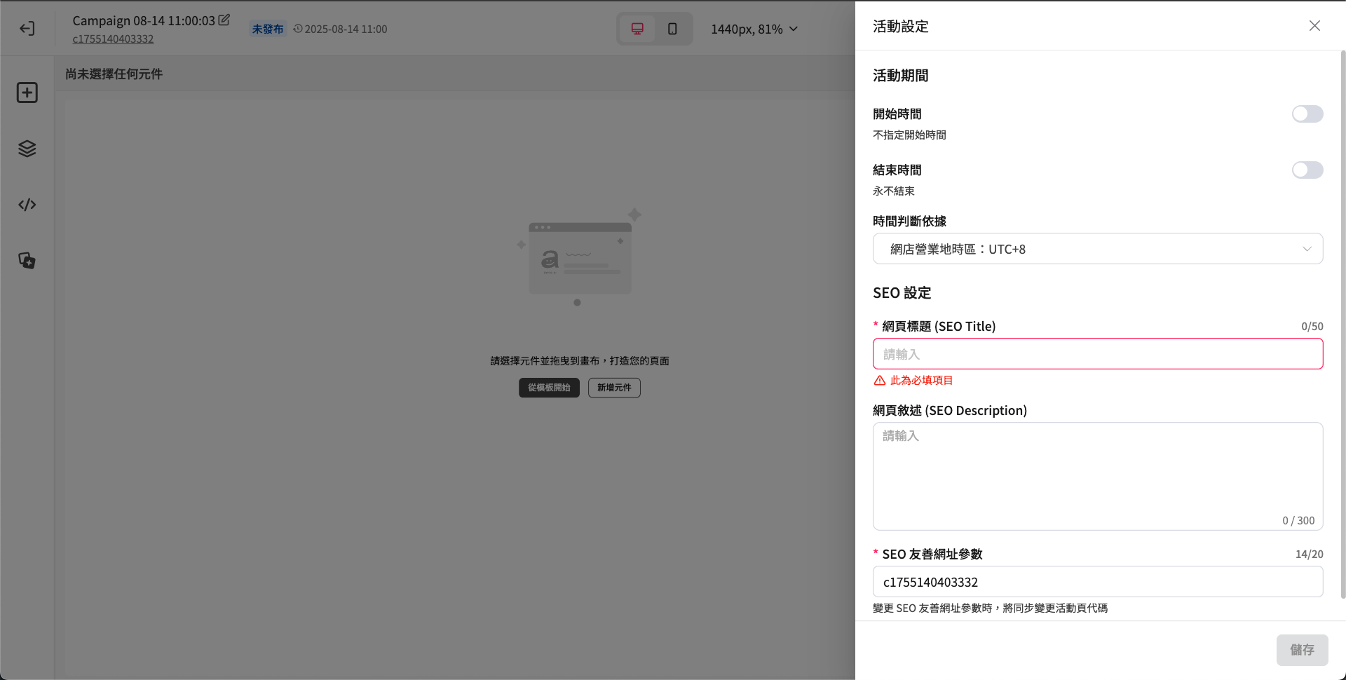 在「活動設定」底下,除了可以設定活動的開始或結束時間,也可以設定活動的網頁標籤 (SEO Title) 和敘述 (SEO Description)。