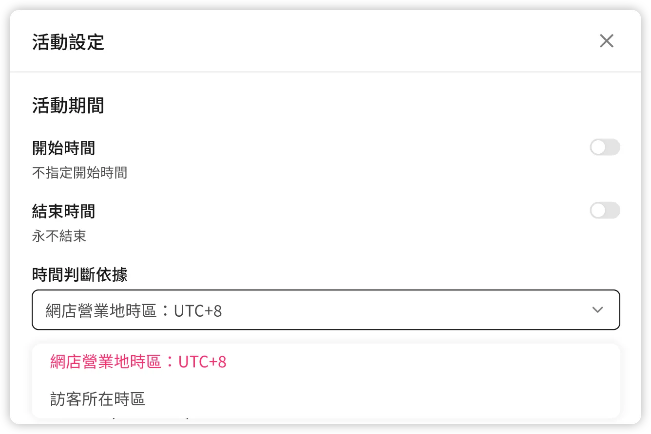 假設活動設定在 22:00 開始,並且網店營業地時區為 UTC+8,則日本人 (UTC+9) 和台灣人 (UTC+8) 都會在同一個時間點(UTC+8 的 22:00)才能看到活動頁。