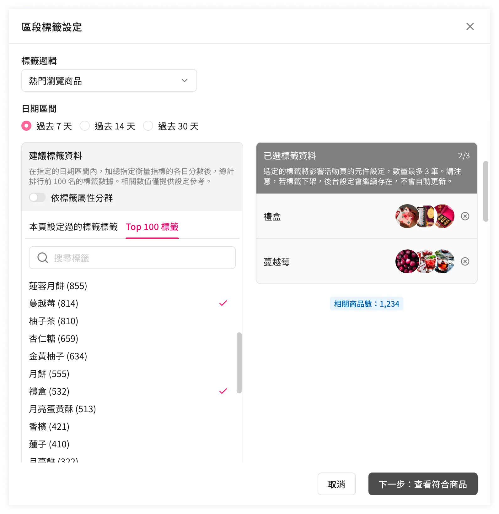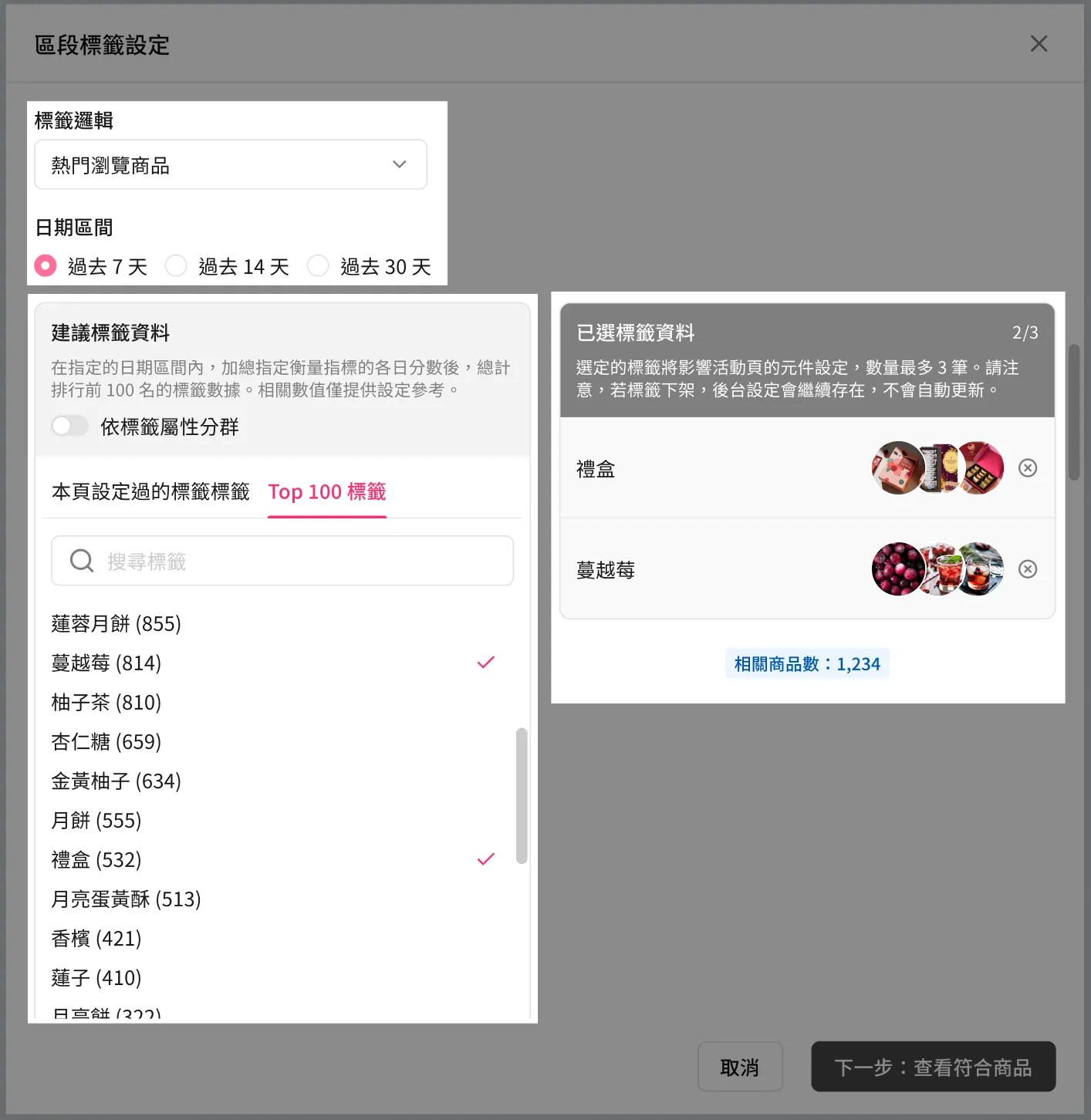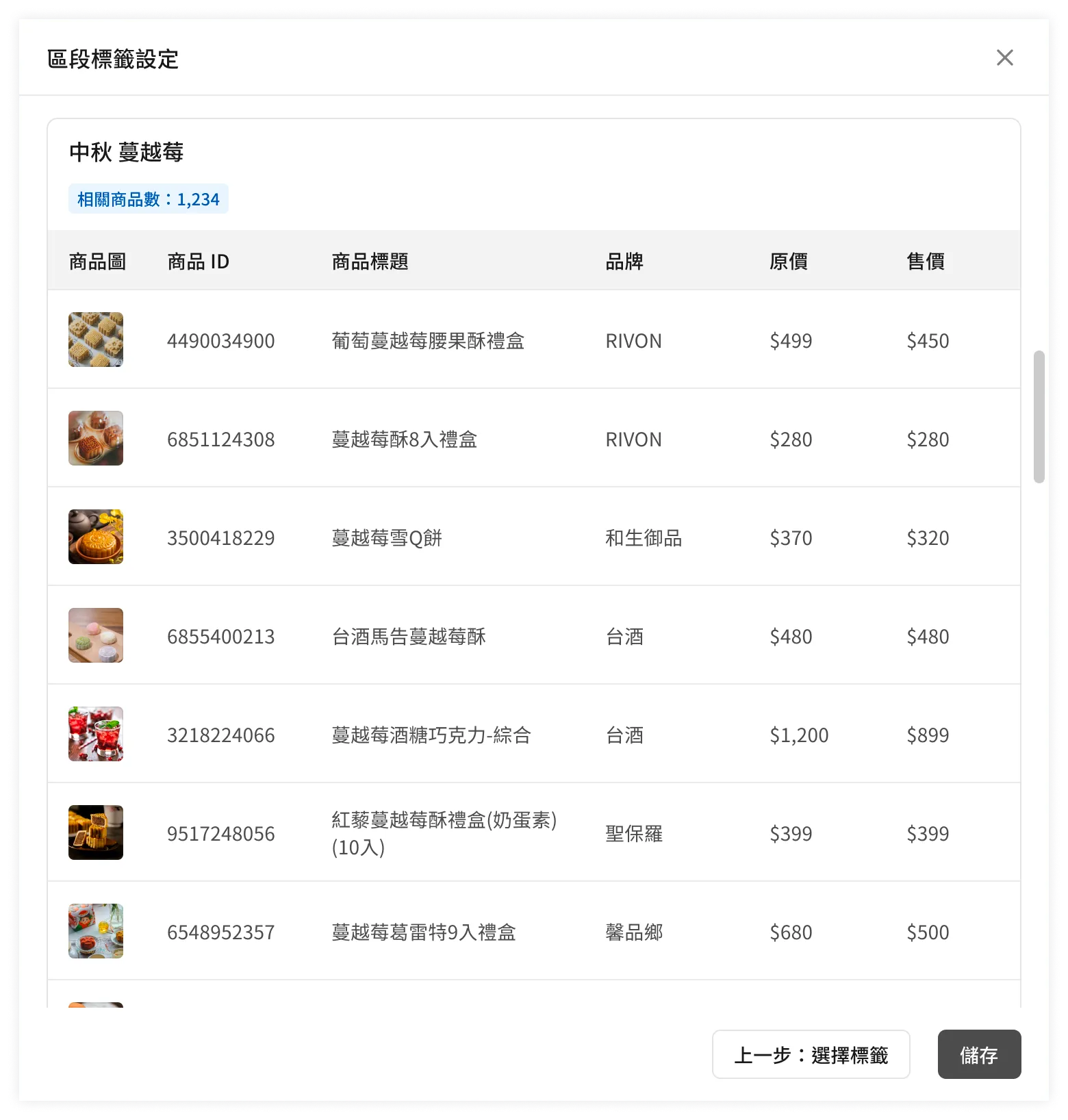 勾選標籤後,點擊「下一步」可查看這組標籤底下有哪些商品,確保不會選中沒有內容的標籤組合。在這個畫面按下「儲存」,就正式設定好 Section 的基底標籤了。