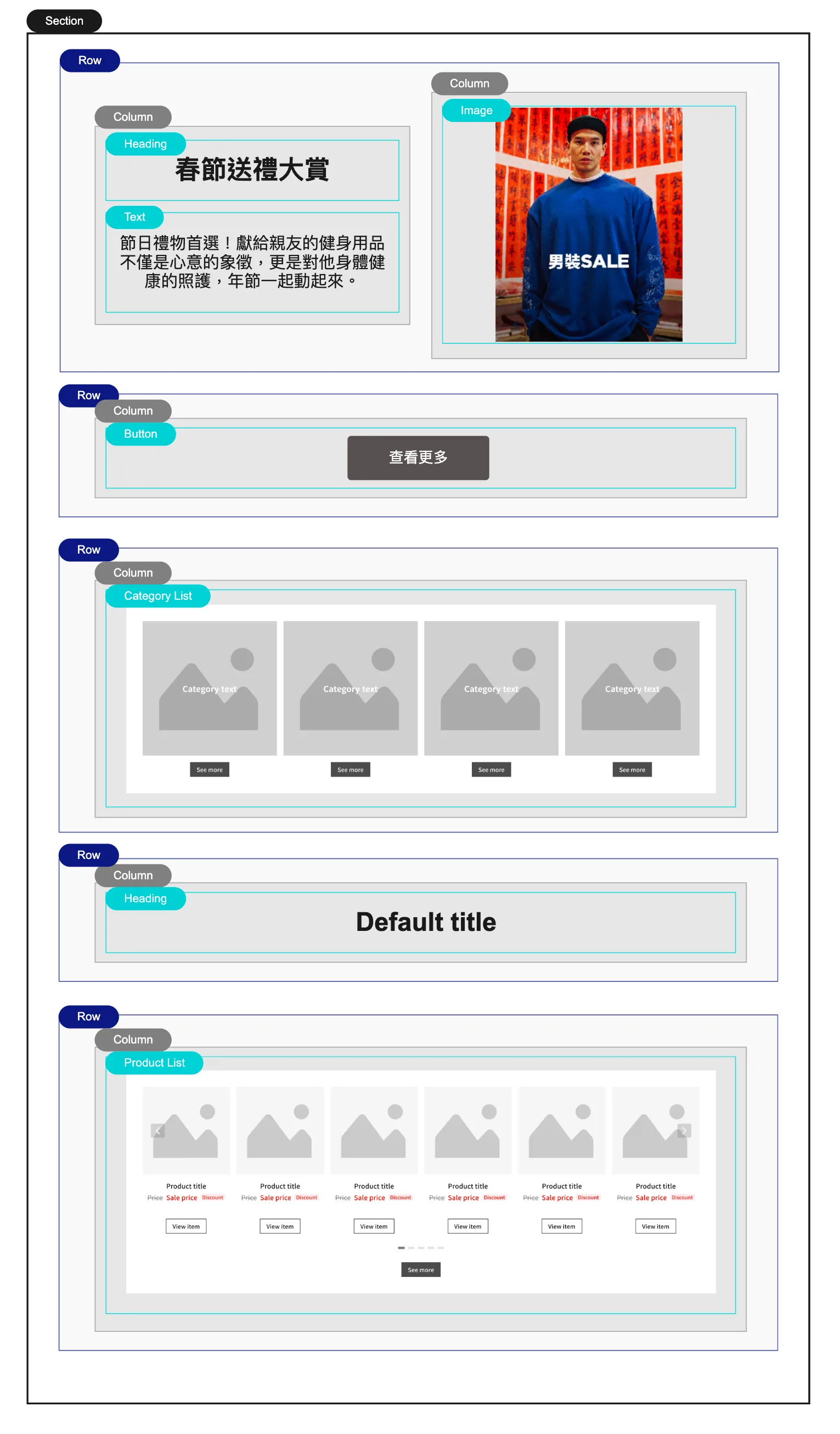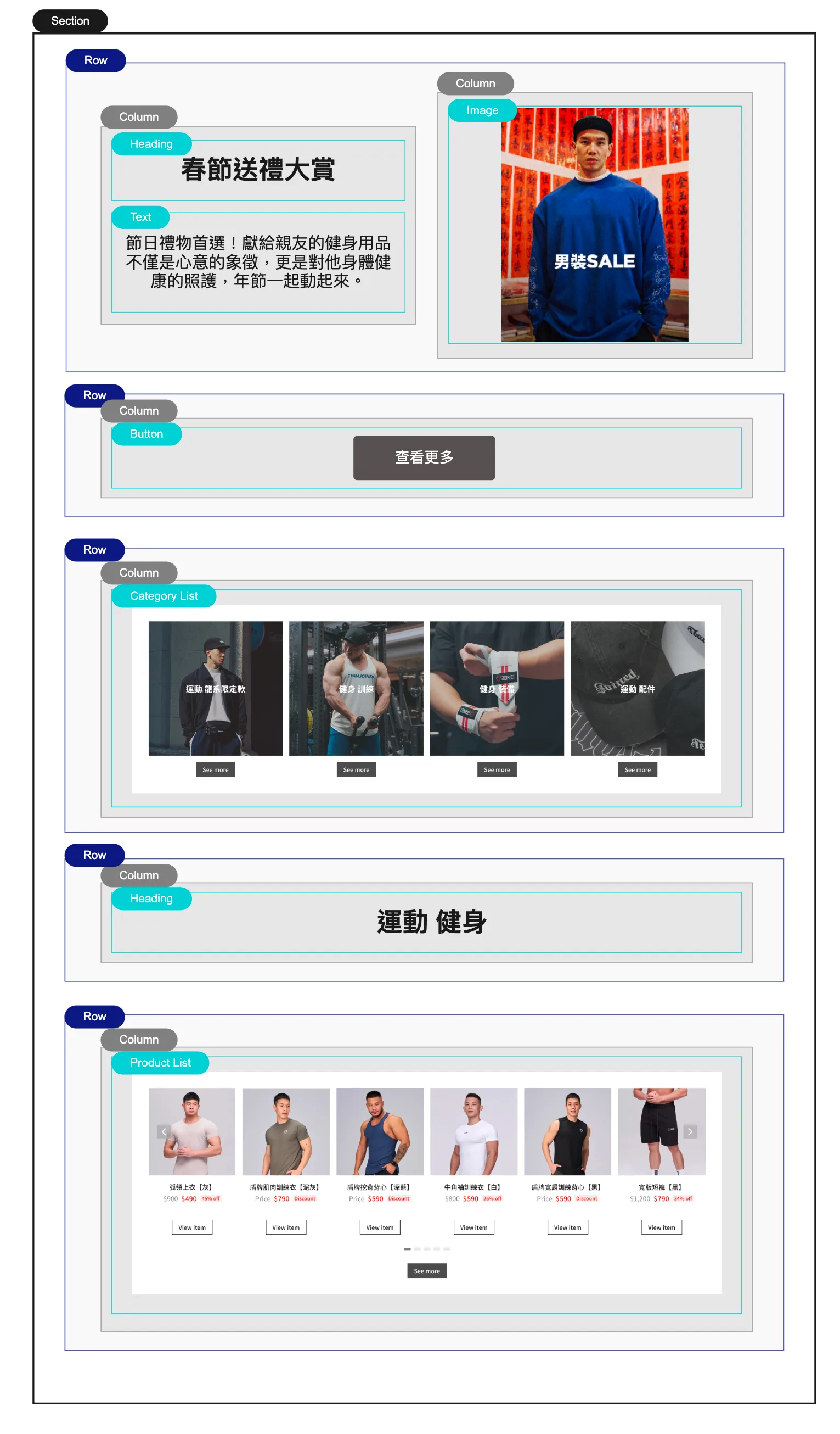 設定後的 Section 標籤,又稱「區段標籤」或「基底標籤」,會聯動影響這個 Section 裡面包含的子元件,加速產生活動頁內容。