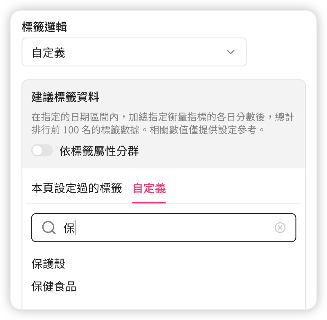 - 「Top 100 標籤」tab:按照指定的標籤邏輯,顯示最多 100 個相關的標籤
