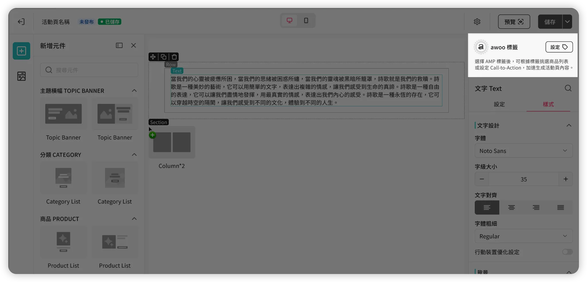 Campaign Star 頁面編輯器的每一個區段元件(下稱 Section)都可以設定 AMP 標籤。