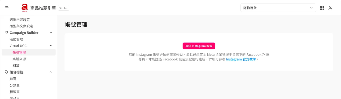 您如果不想繼續使用 Visual UGC 的服務,可以解除連結 Instagram 商業帳號。解綁後,媒體來源的貼文候選池會全部清空,但已經遴選挑進相簿資料夾的貼文仍然會繼續存在於相簿底下,不受帳號解綁的影響。