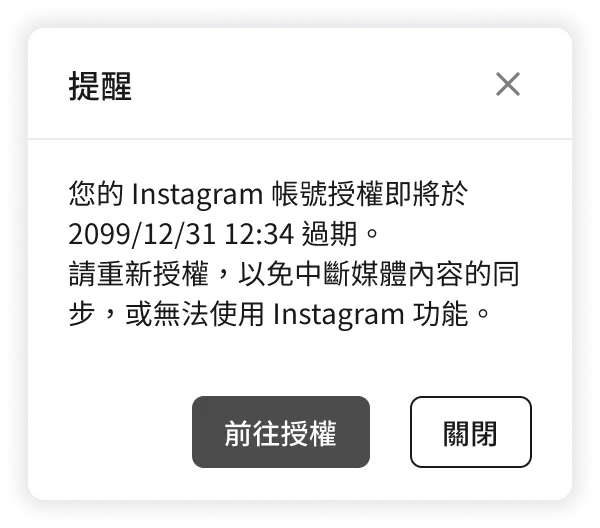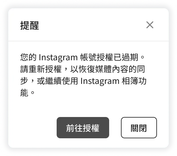 授權過期 | 已同步的貼文仍存在,但不會同步新的貼文 | 已建立的相簿和相簿底下的貼文仍存在,不受影響 | 已建立的活動頁元件和元件所連結的貼文相簿不變,不受影響 |