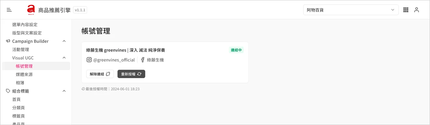 連結成功後,可以看到 Instagram 商業帳號的檔案資訊,和最後一次授權帳號的時間。