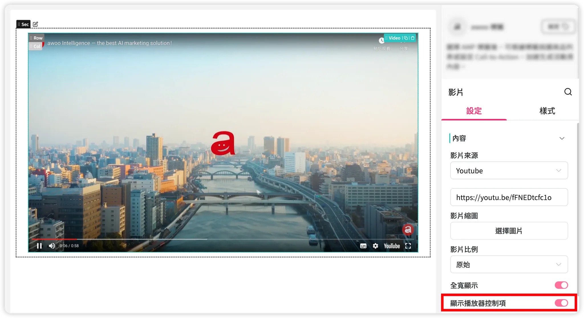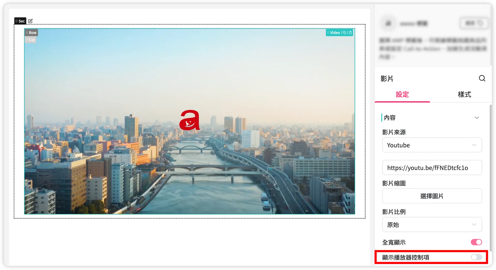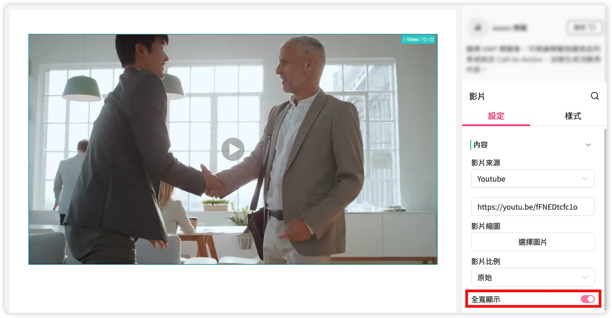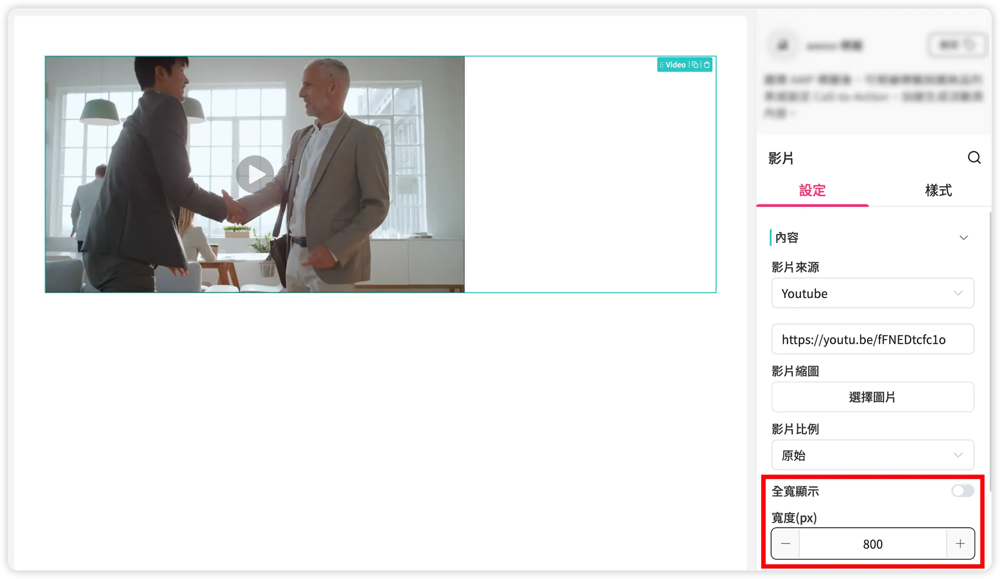 新增影片元件後,預設為「全寬顯示」,此時會依影片所屬的上層 Column 的寬度,100% 顯示