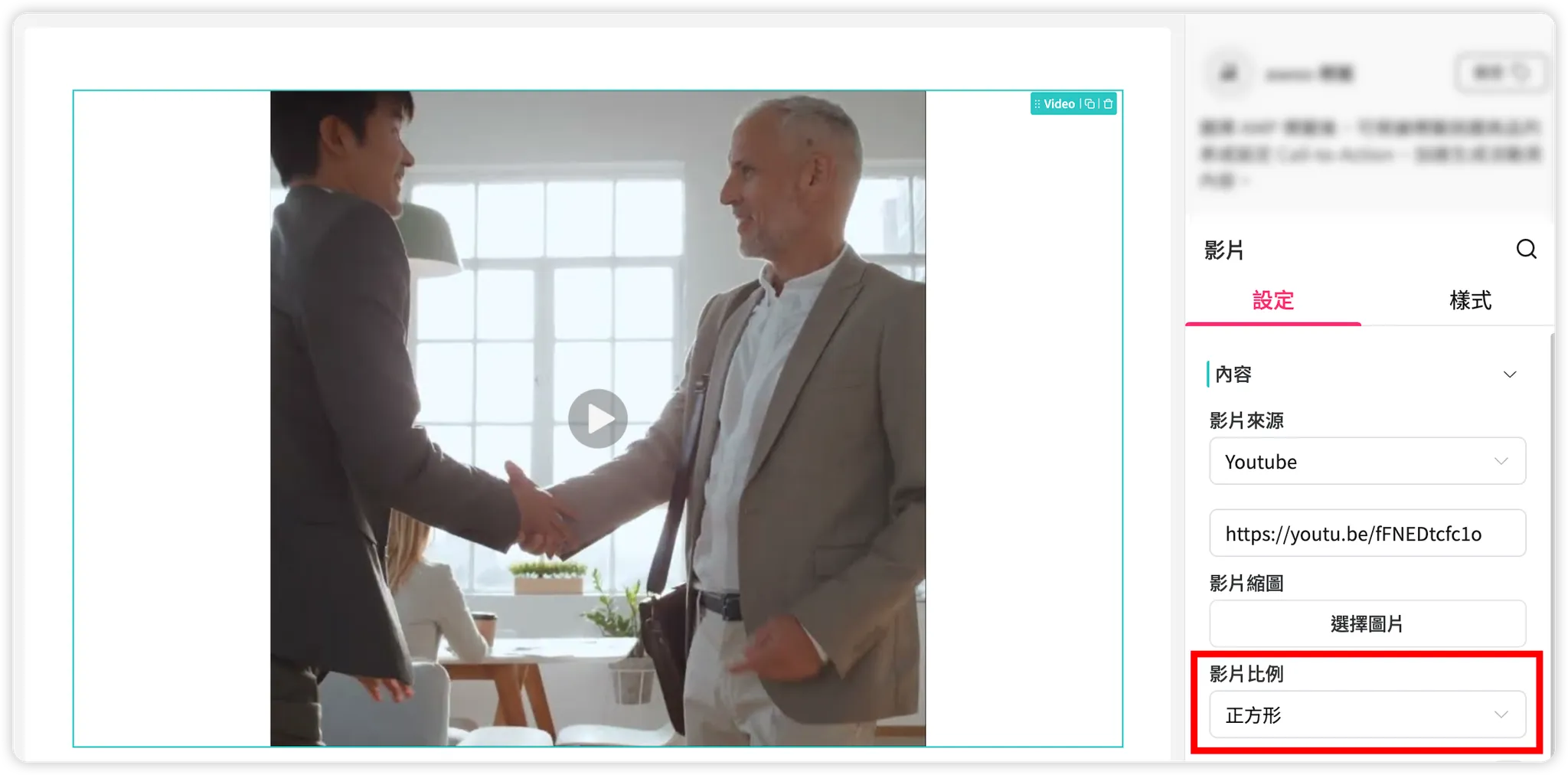 無論是使用預設縮圖或自行上傳的圖片,縮圖一律會置中放大填滿 (cover),蓋住整個影片元件的顯示範圍,超出元件範圍的部分會被 crop 掉。