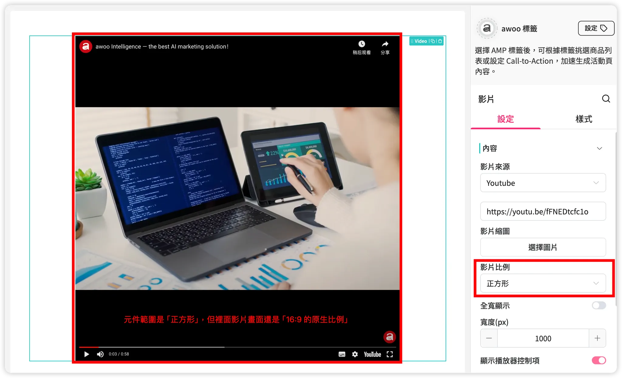 調整「影片寬度」和「影片比例」時,只有影片元件的元件範圍會改變,實際影片播放畫面還是按照影片原生比例呈現,不會跟著變形。此時不滿元件範圍的部分會以黑底呈現。